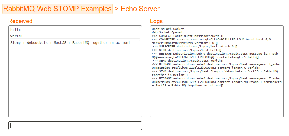 If you enabled RabbitMQ-web-stomp-examples plugin, you should be able to instantly run two examples prepared by us. Just open a web browser at http://127.0.0.1:55670/.