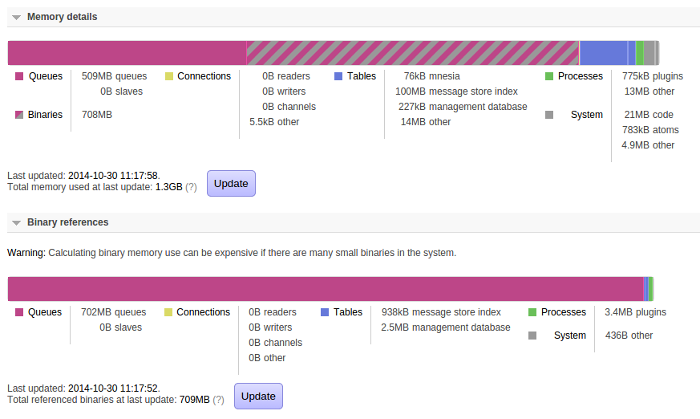 But we can see here that almost all binary use is due to messages in queues. This screenshot was taken from a mostly static broker, so that's what we'd expect.