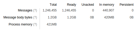 Here we can see another new feature of RabbitMQ 3.4: the queue maintains a count of the total number of message body bytes it contains. So we see that this queue contains 1.2GB of message body content, of which 420MB is in memory. We can assume that the 420MB is all in the binary memory used by queues. The queue is also using 421MB of process memory (a very similar amount purely by coincidence) - this includes message properties and headers, and metadata about each message.